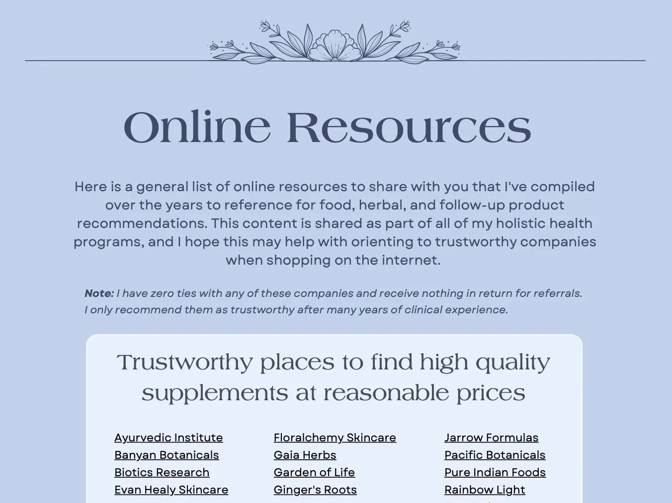 ONLINE RESOURCES Ayurvedic Postpartum Care Overview Easy Meal Ideas Female Hormone Balance Long-term Recommendations Galactagogue Herbal List Herbal Actions Individual Womenβs Holistic Health, Natural Hormonal Balance & Vitality Program Ojas Postpartum Doula Care Package Booklet Restorative Bath Soak Recipe Travel Packing List 10 Strengths Interactive Sheet Beyond Burnout Booklet Five Foods for Hormonal Balance Healthy Carbs Healthy Proteins Healthy Food Plate Balance Herbal First Aid & Home Pharmacy Booklet Kapha, Pitta, Vata Info Mindfulness Eating Guidelines from the California College of Ayurveda Online Resources Perinatal Community Support & Resources Prakruti & Vikruti Safe Home Cleansing Booklet Womenβs Health Cleanse Booklet Closing of the Bones Service Booklet Four Seasons Harmony Values Healthy Fats Herb Ethics MUIH Individual Womenβs Holistic Fertility, Prenatal & Vitality Program Maintenance & Integration Programs Brochure Nasya Info from Banyan Botanicals PMS Clinical Herbal White Paper Relaxing Home Spa Day Card Tongue Cleaning & Oil Pulling 7 Steps to Creating Lasting Hormonal Health Easy Side Ideas(veggie edition)